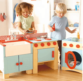 Beanies birthday is coming up and I think it’s high time she have her own kitchen. I of course prefer wood and something that looks nice. However, I’m wondering if I should consider something plastic with lights, bells and whistles. My gut tells me she won’t care–she’s still at that tender age where she’s elated and grateful for any and all gifts. Here are the ones I like so far.