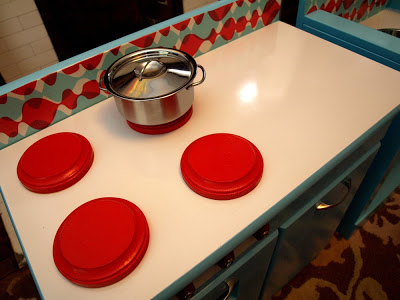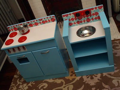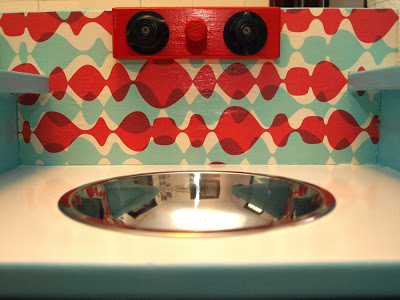 As you can see we painted the whole thing, added a sink, burners and updated some of the hardware. The color scheme came from the backsplash, which just happens to be paper from Snow and Graham–it was simply mod-podged on the back. We’re thinking about changing the handles on the sink to something more chrome-y, and I may add a skirt under the kitchen sink, but overall we’re really pleased with it… actually I love how it turned out. Beanie’s reaction? Ho-hum. Oh well… at least we didn’t spend a pretty penny and now we have something completely original that we made and love. I also love that my husband and I like to make things together and whether or not it actually happens, I’m envisioning this kitchen being played with by future generations for years to come. Good times.