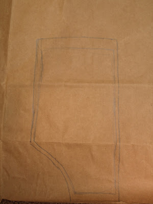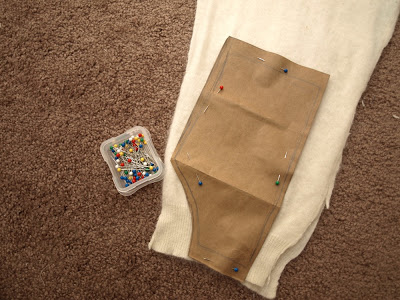 Items needed:  The pink pants that now fit her to use as a pattern, a brown paper bag to make the pattern and the white sweater I’m going to turn into her warm fuzzy winter pants.