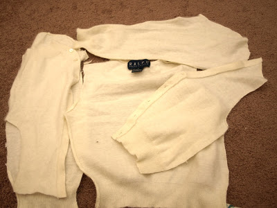 Next I cut up my sweater along the seams so I have the most fabric possible.  (note:  This is a sweater I got at a church clothing exchange…I knew I’d never wear it but that it would make a great fabric to make a stuffed animal or something.  It’s super soft angora and lambswool or some sort of heavenly blend.  I also have a cashmere sweater put away for the same type of idea…so just a tip for you second hand shoppers–be on the lookout for homely but luxurious sweaters.)