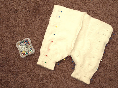 Now unfold those 2 pieces of fabric and lay them on top of each other (right sides together) and pin along the sides and around the crotch.  You’re going to sew all those edges you just pinned.  I forgot to do a finished picture of that part.