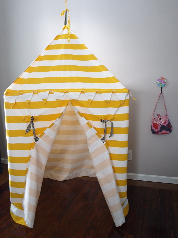 OK so the first tent is posted in the shop–check it out! Hopefully I’ll get the second one up today. I have to say going with one fabric pattern for the whole tent is a bit of a departure from my previous tents, but I think it turned out well. Plus these are a lot more gender neutral than most of my previous ones. And these are the new tents with 1 hook and a PVC pipe support on the inside…SO much easier to hang. I hope you likey…
