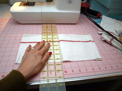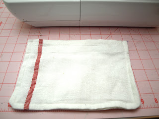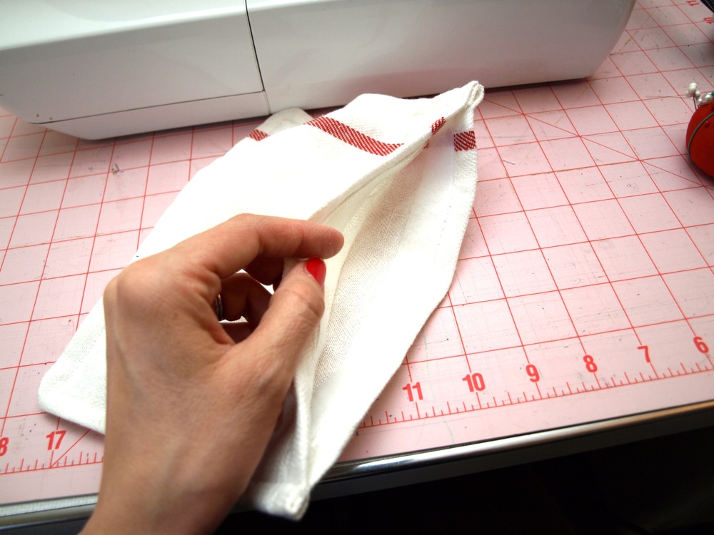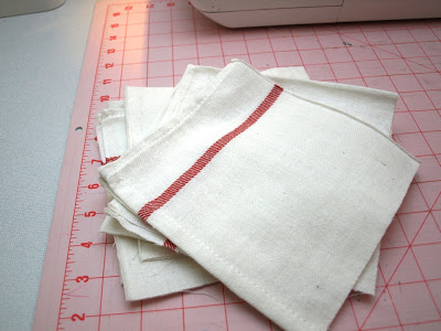 First, I started with tea towels from Ikea.  A few years ago a friend turned me on to them as great oversized and cheap fabric napkins.  They’re only $0.49 each and the perfect breathable, washable fabric for this project.  Then you just need a rotary cutter or scissors and some velcro.