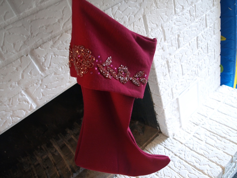 As you can see it’s a beautiful, albeit worn, suit with gorgeous beaded detailing.  The color in these photos is not accurate as it’s more of a dark fushia and not a brick red.  While I’ve wanted to make something with this vintage suit for a while I couldn’t ever figure out just what to make.  I wanted it to be something special that would be around for a long time.  Last week I had my ah-ha moment for this suit when I decided to make a stocking.