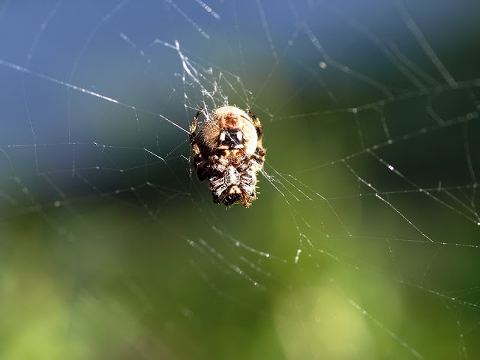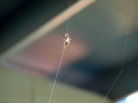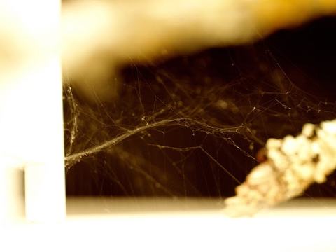 We never really do Halloween decorations outside. As if on cue a plump neighborhood spider took notice and decided to help us out by spinning a very large web near our front porch a week before Halloween. Fortunately my husband took one photo with PSP standing behind the web for perspective’s sake. (Yes that is our chunky little spider friend covering her eye.) This web is no joke…