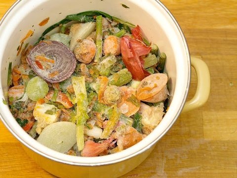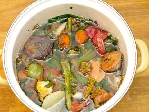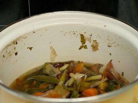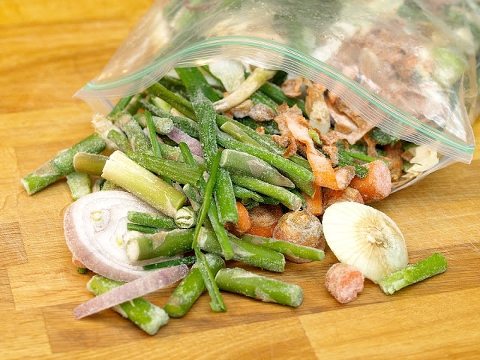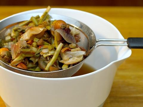 1.  Start with saving the scraps from your veggies in a baggie kept in the freezer.  Good examples are asparagus ends, onions ends, leeks and scallion greens, carrot peelings, celery ends, mushroom stems, even some herbs like parsley and thyme.  As she says in her book, stay away from eggplant and cruciferous vegetables such as cabbage, broccoli, cauliflower, brussels sprouts, kale and collard greens.  In no time at all, you’ll have a full baggie.