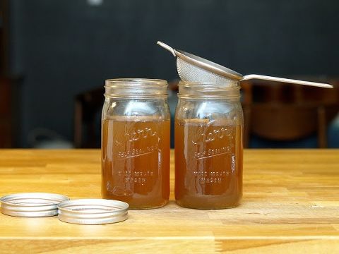 6.  Lastly, I pour the broth into large canning jars (I used a small strainer once again just to make sure).  I put the lids on loosely and then place in the freezer.  Once frozen I tighten the lids.  I like using glass jars as it makes for fast thawing in the microwave, but you can certainly use other containers for storage.  You can store in the refridgerator, but I suggest freezing unless you plan on using the broth within  a week.