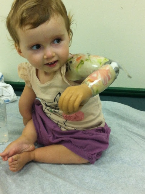 In truth prosthetics are one of those widely misunderstood things when it comes to limb differences. Just to be clear, I’m talking about upper prosthetics here–they’re a completely different ball game from lower prosthetcis. When Lamp was first born we were told by the medical community that her best shot at using prosthetics in the long run is to have her fit as young as possible so her brain basically gets used to the idea of having this extra appendage there, even though there is very little function. As you may recall she took to her prosthetic arm very well. She never used it to grab with her other arm–well, not much–but she used it a lot to lean on and for balance–like in this picture here.