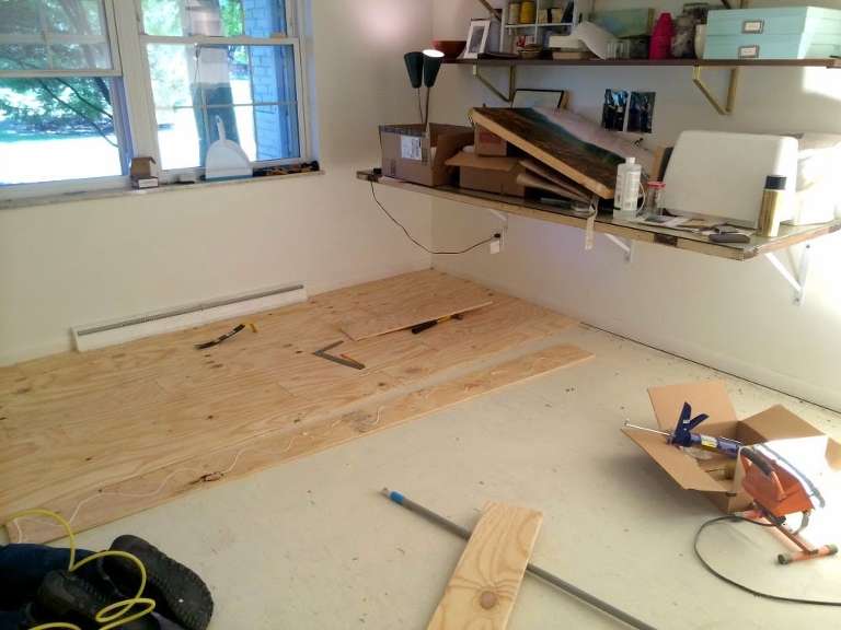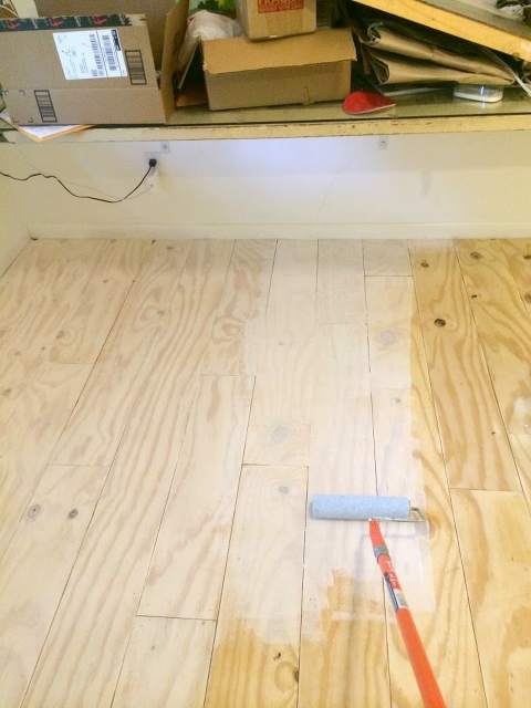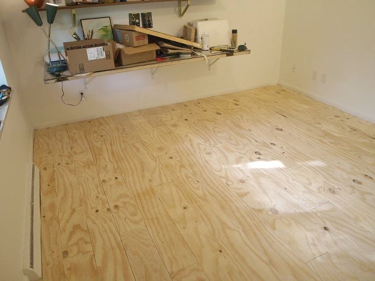 Having seen this DIY wide plank floor using plywood around the internets I knew this is what I wanted for my studio floor. Something inexpensive (because studios get messy) but still beautiful. I really love mixing rustic/bohemian and modern. So these floors were perfect. I primarily referred to these two posts when tackling this project: Little Green Notebook and Picklee.