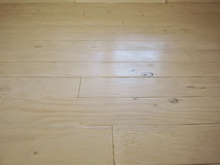 I rolled the whitewash on and immediately thought it was too thick. So I used a rag and just wiped the excess away. Since I do this quite a bit when painting on canvas I wasn’t intimidated by this process at all. I mean the great thing about this floor in general is that you’re going for imperfection–so it’s really hard to mess up whether it’s sanding or painting. Seriously, the warps, gaps, knots, color imperfection all add to the charm. So that’s what I did the whole way across–paint it on, wipe it off. I would do about 3 boards at a time and roll the whitewash on. Then starting at the top I’d wipe it off. It was good to let it soak in a minute or two, so I didn’t wipe right away. (You can see this process in the photo above.)