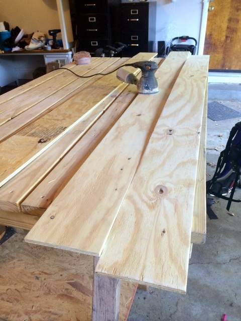 First I sanded each plank with the electric sander. Plywood is rough so I wanted to smooth it out a little and go around all the edges essentially beveling each one. But I knew I was going to be coating these in poly, so I didn’t worry about getting it super smooth. One problem is that I thought I was using 80 grit sand paper (which is rough) but realized later I was actually using 120 grit (which is substantially finer) thus the sanding took longer than it should have. If I were to do it again, I’d get a rougher grit paper. Each board took about 3 minutes on average.