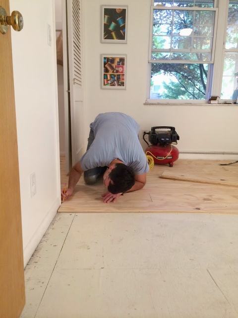 Earlier I had called home depot and placed an order for 5 sheets of plywood (too few) cut the long way in 8″ wide planks (They cut them 7″ wide. A mistake we would not catch until the next day when the floor was 3/4ths of the way done and we had to call and order more wood. And then cut those 8″ wide planks down to 7″ wide planks to match the first ones. This mistake cost us a few hours.) By that evening B had picked up the planks along with some other supplies while I had removed the backboard, the staples and nails and vacuumed the floor. We were ready to go Friday morning.