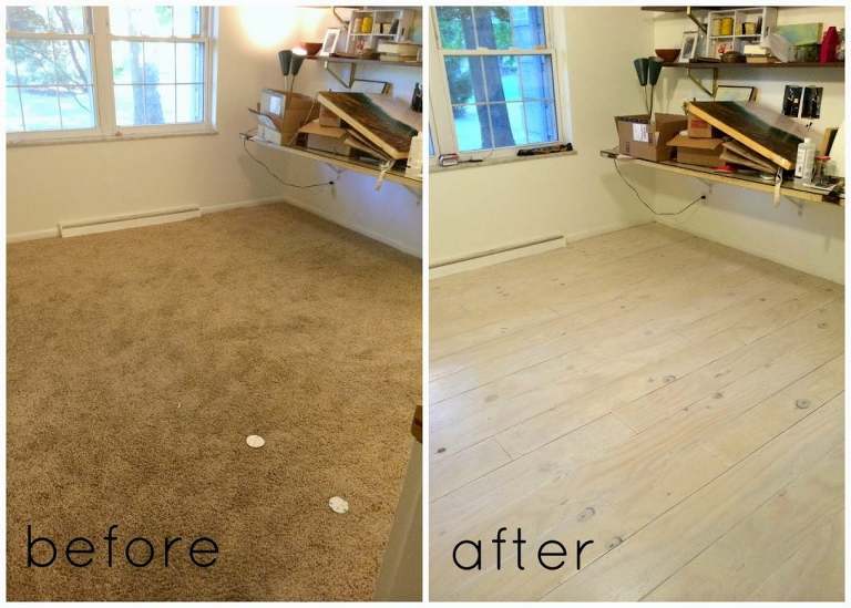 Saturday was whitewash day. Although both tutorials and my floor were all white washed, I think this floor would also look fantastic in a more traditional wood stain as well. However, one of the problems with my studio is that it happens to be one of the darkest rooms in the house. The brown carpet wasn’t helping. I really wanted to lighten it up with a whitewash–this part was easier than I thought it would be. Just don’t over think it. I grabbed some old white primer we had laying around and added 2 parts water and mixed. That was it. Primer works great for that chalky, worn look. The application is probably where I differed the most when compared to the other tutorials. Just make sure you vacuum your floor really well before laying paint. Dust and paint are not friends.