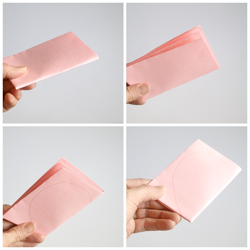 Now you’re going to cut half a heart shape on this piece of paper. Assuming you’re right handed, hold the paper in your left hand and the long sided fold on the right and the open parts of the paper on the left. You want to make sure that instead of ending the cut on the same side as you start the cut, you want to end it on the bottom of the paper so that you include the corner of the folds in the heart. (I’ve drawn it out below so you can see the heart shape, but no need to draw it when you cut on your own).