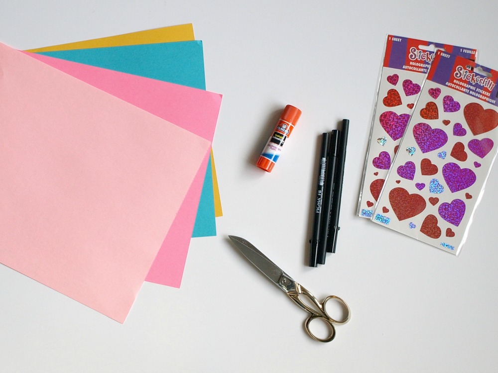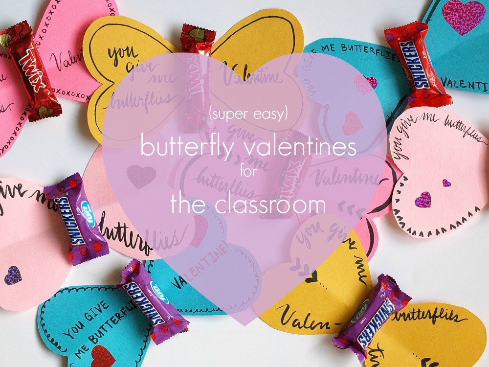 When it comes to crafts, and in this case classroom Valentines, I want the idea to be simple, easily executed and for some reason the most important thing is to have all the supplies on hand. I don’t mind taking a little time to actually make them while I hang out with my kids, but I detest driving around to gather craft supplies for an ‘easy craft.’ I had the idea for these super simple Valentine butterflies last week and the only thing I had to buy was a bag of Valentine candy (full disclosure: I also needed more construction paper, but that is something I usually have on hand). One piece of construction paper folded 3 times, with 1 simple cut will yield 2 Valentines! Some stickers and a handwritten message, glue on your candy bar and your done. Homemade valentines for kids don’t have to be that hard, and with a little effort, they can be super adorable.