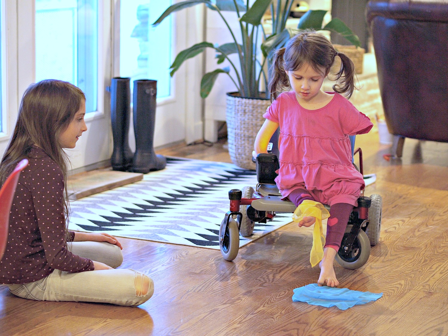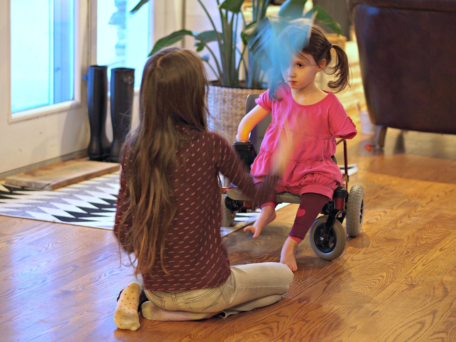 This is how PSP has always treated her sister (for the most part)–they play together, they read together, they do lots of things together. But sometimes PSP climbs a tree in the backyard while Lamp sits and watches. Sometimes PSP runs in the backyard really fast, and Lamp’s chair still lags behind. They do stuff together, but it’s not like they both don’t understand the limitations that Lamp has either.