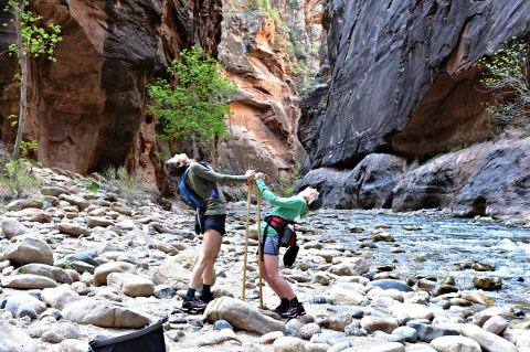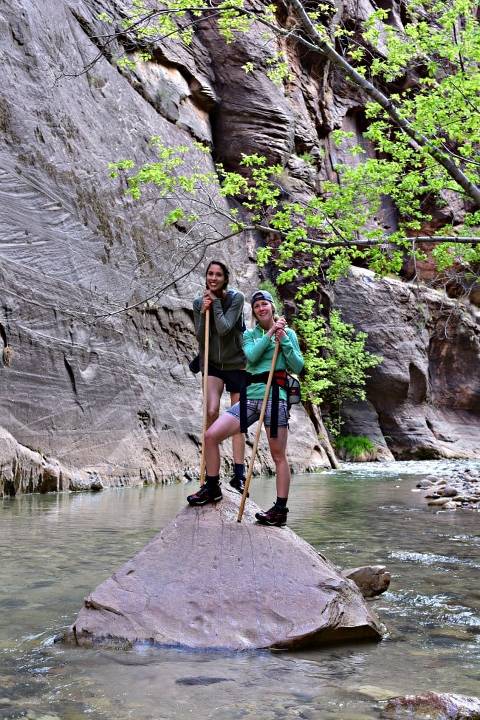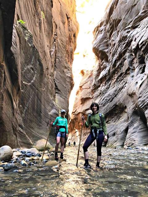 The first hike we did is The Narrows. If you come to Zion National Park and can only do one thing, I would recommend The Narrows. You are essentially walking through water with red rock cliffs on either side, with twists and turns and beautiful scenery for miles and miles. You can go as near or far as you want to go. Now I have done a similar hike in Oregon called Oneata Falls and it was amazing. Beautiful, lush, cliffs on either side, walking through water, at one point chest deep even. But the entirety of Oneonta Falls is 1/2 a mile. The Narrows, by contrast, is long. Miles and miles long. We still don’t know exactly how many miles we went, but we started our hike at 9:15 in the morning, and we finished around 2:30 in the afternoon–that’s over 5 hours of hiking through these beautiful canyon walls. It was rather chilly in the morning, but the light was perfect. There were rays of sun streaming through cracks in the steep red walls, creating a beautiful, gentle light. We were much warmer as the sun creeped overhead around noon, but honestly I preferred the chilly, perfect light. The water that was often mid-calf, but also up to our waist at times. Had we gone up even further we would have been chest deep. As I said, the water was cold but we rented booties and boots, along with walking sticks–all of which I highly recommend–and our feet held up well.