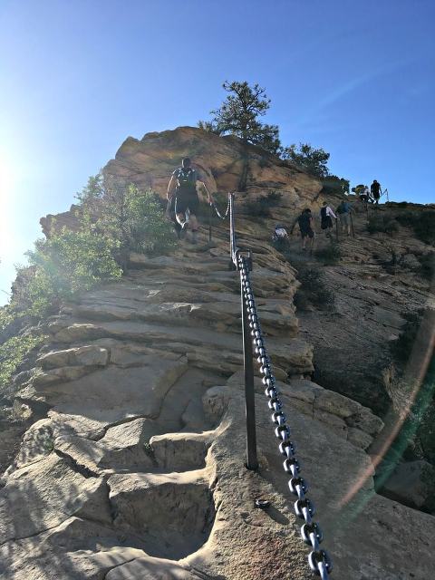 Saturday was our day to hike Angel’s Landing. As mentioned previously I had no idea what I was really getting into. Where The Narrows was low, wet and cold, Angel’s landing was high, dry and hot. And dangerous. No really. It has often been cited as one of the most dangerous hikes in the US. But being the haughty daughters we are, we hiked it. We bragged about it and a week later I’m still feeling like a bad apple. Was it scary? Yes. There was in fact our friend Fran almost didn’t go. She was actually petrified (Fran, if you’re reading this, is that fair to say? I feel like petrified is a fair word to use.) See the first part of the hike is 2 miles, steep and with a lot of switchbacks. And while technically you could fall off the side of that trail, it’s wide, flat and paved. You’d have to really not be paying attention to fall. But once you get to the top there is a turnaround before the last half mile where it gets real ya’ll. Real real.