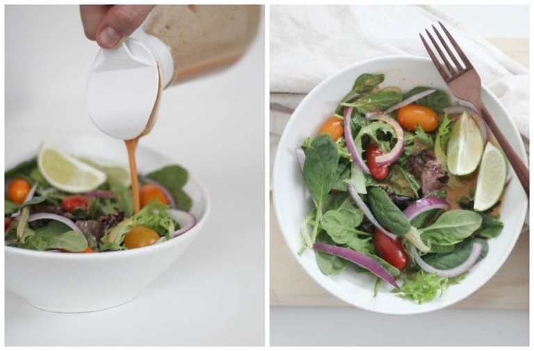It’s funny how salads have become synonymous with healthy, when a salad can be pretty much anything you want–including unhealthy. Of course this depends a little on your definition of “healthy” but for many restaurants salads can be one of the more fatty and calorie-heavy options. Last year when I started tracking my macros I felt like for the first time I had an idea of what “healthy” really looked like, and it was all about balance. Making sure I’m getting all my macro-nutrients–protein, fat and carbs–in the right proportions. I don’t keep strict track of my macros anymore, but I’m still very mindful of increasing my overall protein intake while keeping my fats and carbs at medium levels. When it comes to salads it’s easy to hit the right amount of proteins, fats and carbs with the base ingredients–greens, chicken, beans, peppers, fennel, sweet potatoes, avocado–just to name a few favorites, but it’s the dressing where that balance can really get out of whack. I prefer homemade salad dressings for the simple fact that you can’t beat the taste! But most dressings call for 1/2 cup or more of oil. Straight up oil.