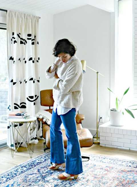 I’m all about layering a ribbed turtleneck and here I do it two different ways. One is under my favorite beautifully textured sweater by Jamie and the Jones, and in the photo at the top, a summer shift dress (that I actually made. DIY here.) I think both of these outfits have me feeling that 70’s girl vibe and I am here for it! Really I think a ribbed turtleneck layered under a short sleeve gives it that vintage 70’s feel, and with the addition of my favorite vintage Frye boots I’m good to go. What I love about that look too is that it has that perfect Fall cozy factor, but also the skirt with bare legs helps me feel a little cooler so I don’t overheat. (Easy to do in Fall weather that starts out cooler and warms up as the day goes on.) The turtleneck and sweater paired with bell bottoms below (they’re back! Not boot cut, legit bells.) + my clogs also giving me life! These are two of my favorite lewks from the whole closet shopping event.