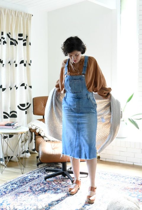 Then I switched out the sweater underneath the overalls, and put on a button-up (one of the new shirts–I love it) paired with a favorite cardigan. Still love. Cozy and cute.