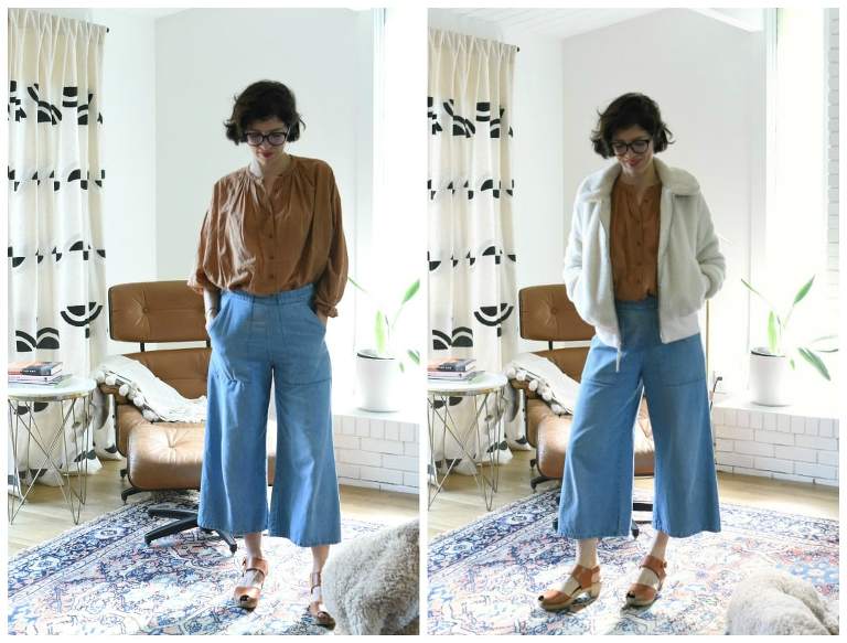 Finally, taking the same button-up again, I’ve paired it with my favorite denim culottes and then a Teddy bomber from last season that I love, but again didn’t wear too much. Pretty simple stuff, but again I love it. (Especially with my black glasses that I don’t wear that much since I love contacts, but this outfit makes me want to wear them more.) I dig this jacket with this outfit as a great throw-on if it’s chilly, take-off if it’s warm piece. Again, Fall temperatures always going up and down in the same day make easy layers a necessity for me.